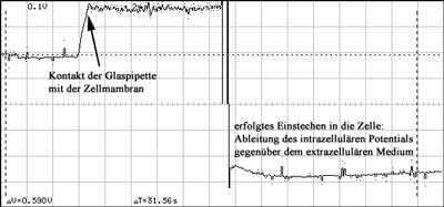 An HeLa Cx43-Zellen wurde das intrazelluläre Potential gemessen. Die Zellen wurden in physiologischer Na-Ringer-Lösung kultiviert. In diesem Beispiel konnte in der Whole-Cell-Konfiguration ein Zellpotential von -47 mV gemessen werden.